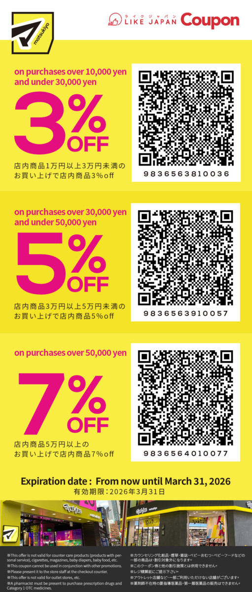Get 5% OFF when you spend JPY 3,000 or more (including tax) with this special coupon.