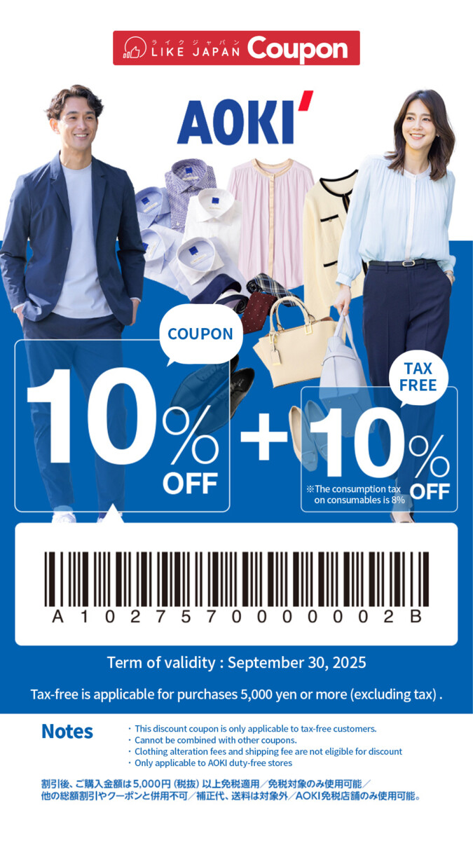 Japan Travel Coupon 11. AOKI Japanese Suit company: 10%OFF + Tax Free
