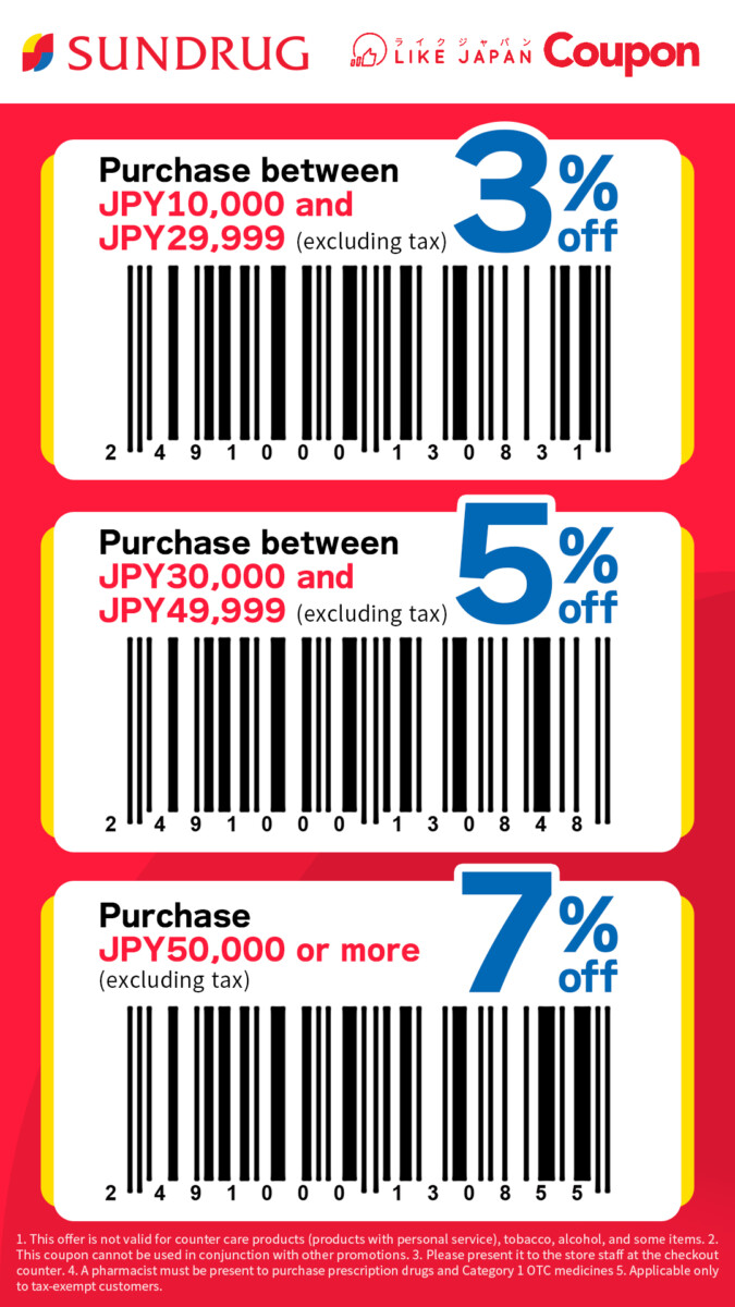 Now, you can enjoy tax-free shopping plus an additional discount of up to 7% OFF by using the LikeJapan travel coupon app or the exclusive SUNDRUG coupon!