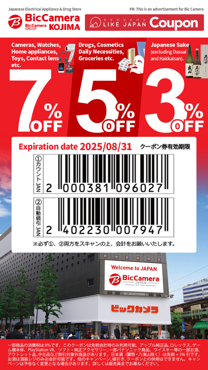 For international travelers, shopping at BicCamera is already a great deal because you can enjoy tax-free shopping (10% off) on purchases over 5,000 JPY (before tax) in a single transaction at the same store on the same day. Now, LikeJapan readers can enjoy even more savings! Use this special BicCamera coupon at BicCamera, Sofmap, and KOJIMA stores to get up to an additional 7% discount on your purchases. Save the coupon below and make the most of your shopping in Japan!