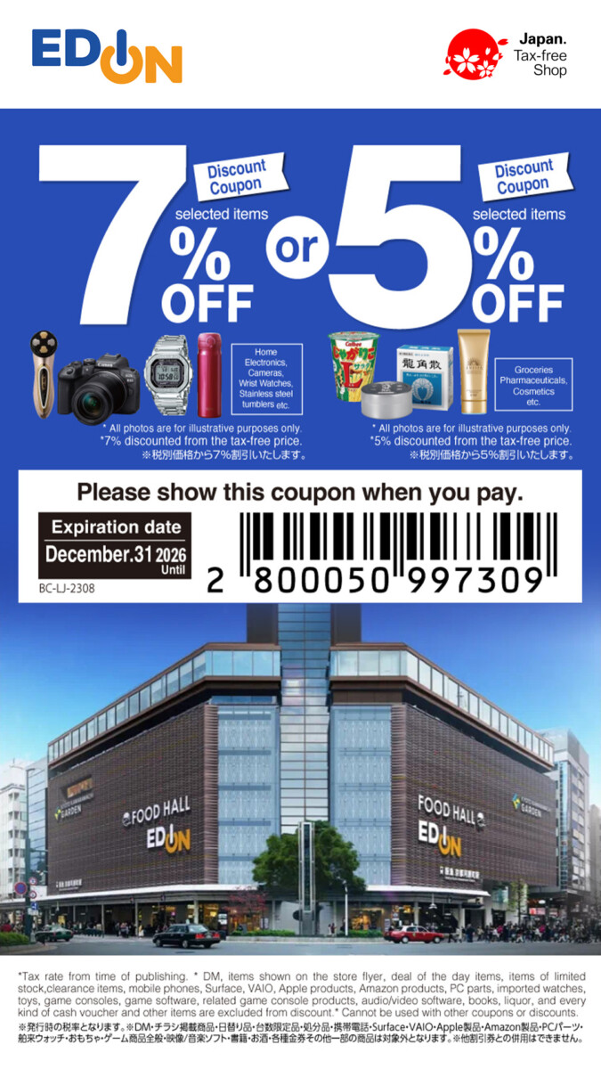 Japan Travel Coupon 9. EDION Electrical Appliance & Gaming Store : Tax Free 10% + Up to 7%OFF