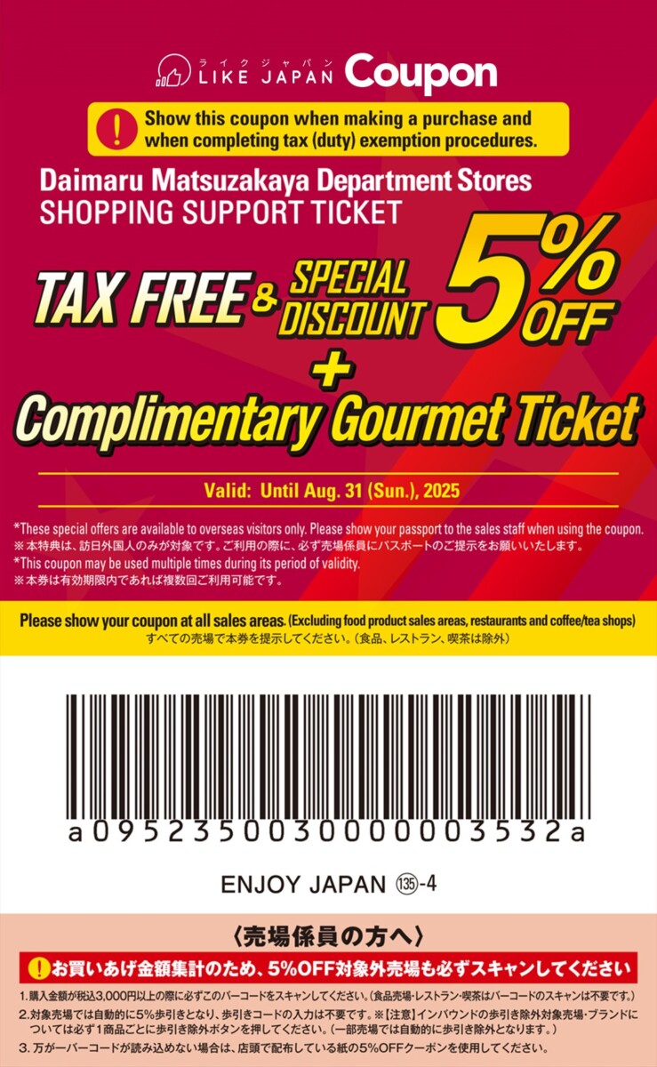 Japan Travel Coupon 14. Daimaru + Matsuzakaya Department Stores 5% OFF + Tax Free with bonus Gourmet Ticket